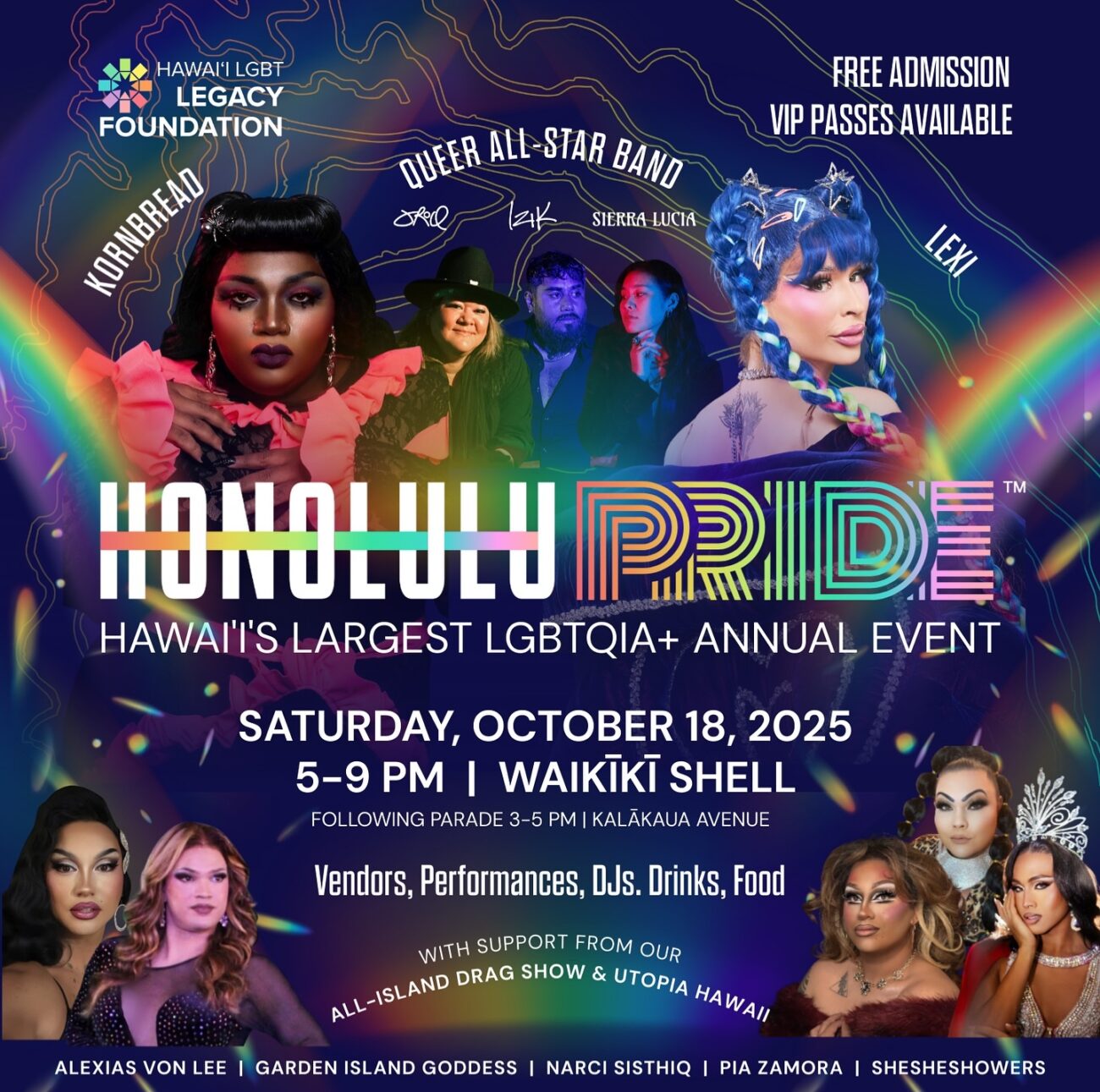 Honolulu Pride 2025 will take place in Waikīkī, Honolulu, with the main events happening on Saturday, October 18. The Pride Parade kicks off at 4 PM, marching down Kalākaua Avenue from Magic Island to the Waikīkī Shell, followed immediately by the Pride Festival at the Shell starting at 5 PM. The festival features live entertainment, food vendors, community booths, and a vibrant celebration of LGBTQ+ pride and culture—all set against the backdrop of Honolulu’s iconic beachfront.